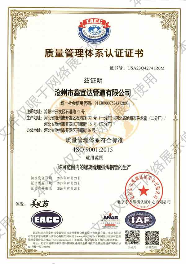 滄州市鑫宜達管道有限公司成立于2003年7月,坐落于滄州經(jīng)濟開發(fā)區(qū),占地面積40萬平方米,注冊資金1.81億元,是集螺旋鋼管生產(chǎn)、防腐加工以及無縫鋼管、卷板、帶鋼等品類鋼材經(jīng)營銷售于一體的工貿(mào)型企業(yè)。公司現(xiàn)有員工400多人,其中,中高級技術(shù)職稱的人員達120余名。 滄州市鑫宜達管道有限公司擁有9條螺旋鋼管生產(chǎn)線和3PE防腐生產(chǎn)線,可生產(chǎn)直徑219--3640mm,壁厚5.5--28mm,最高鋼級X100的各種規(guī)格防腐螺旋鋼管...